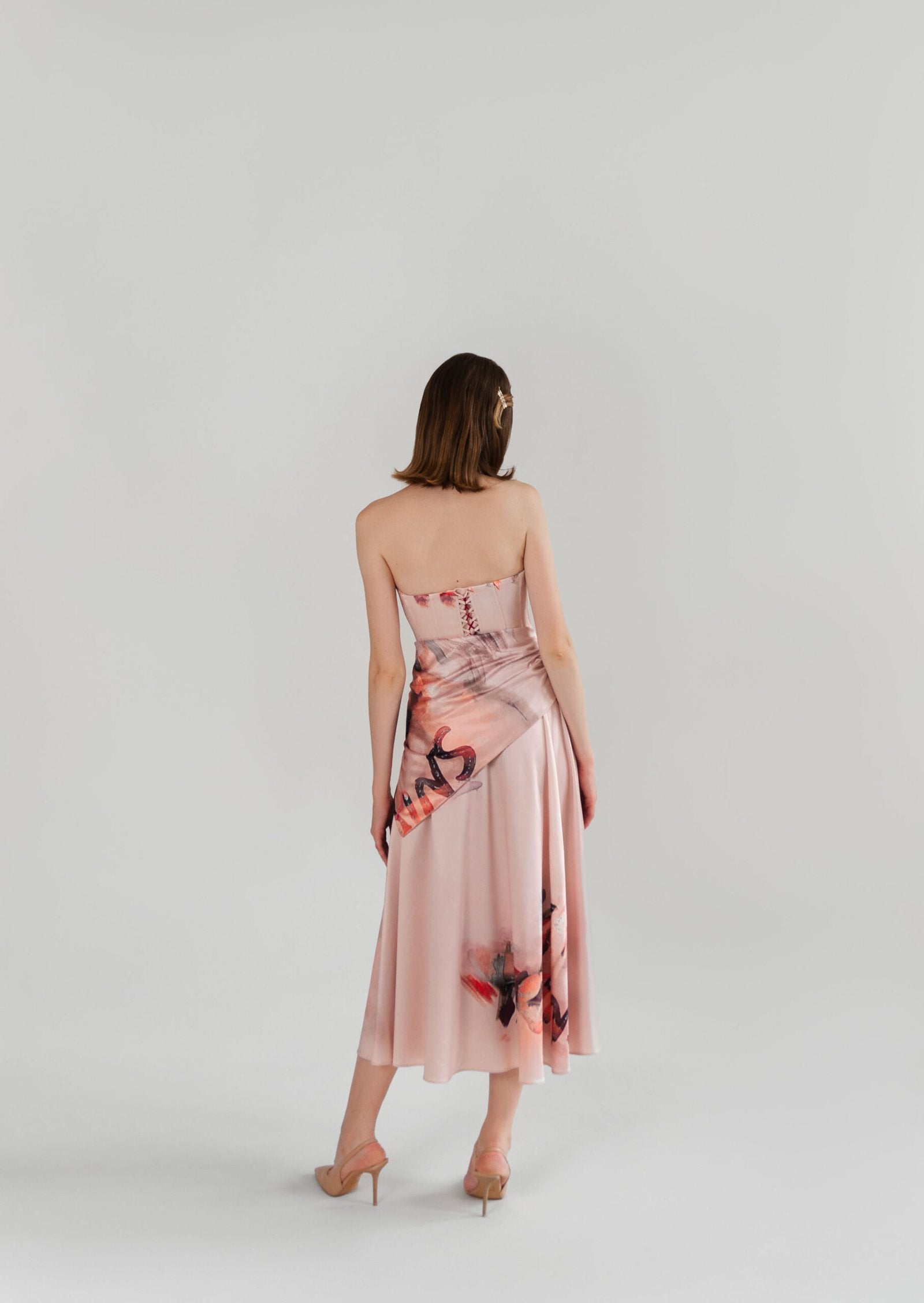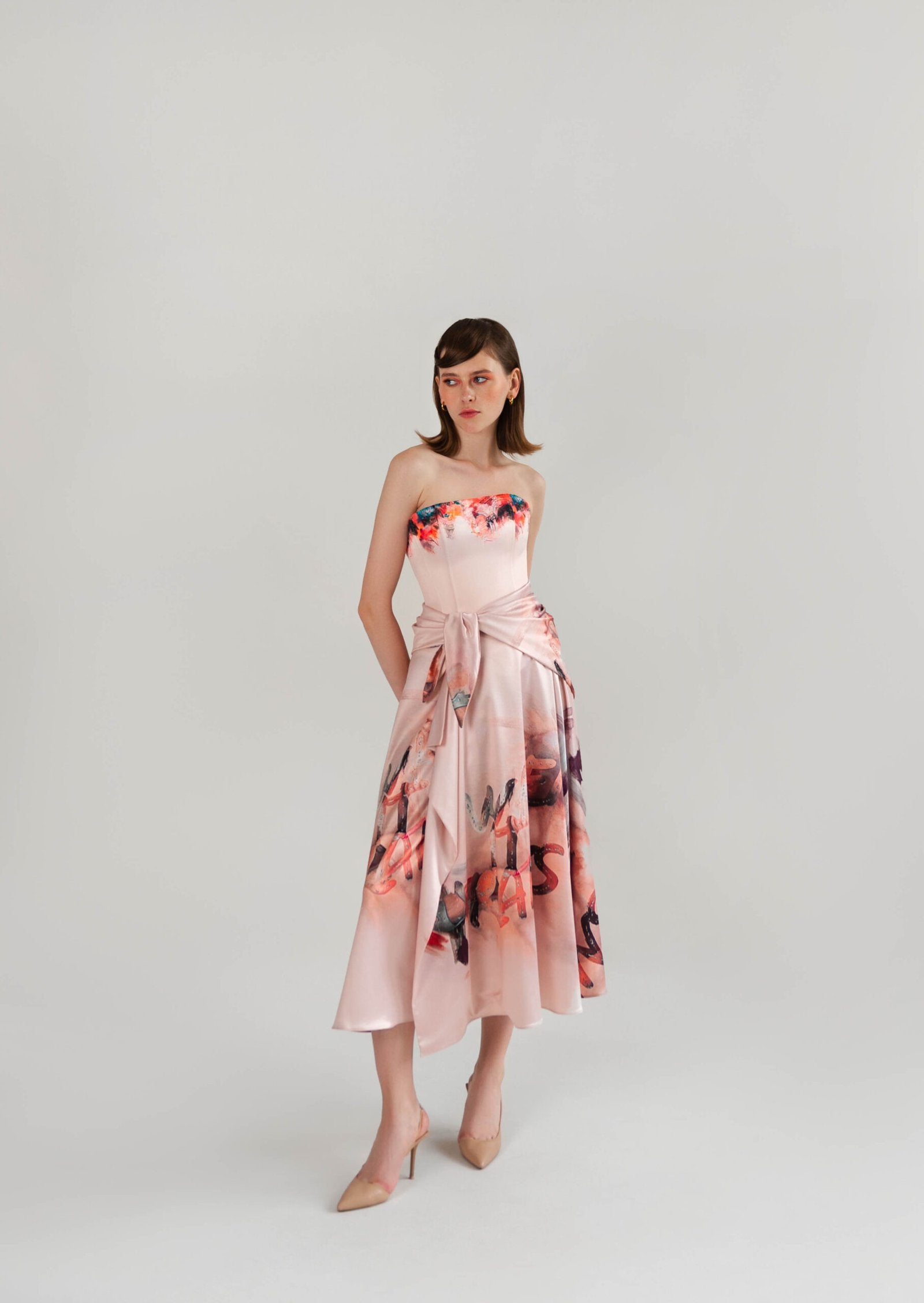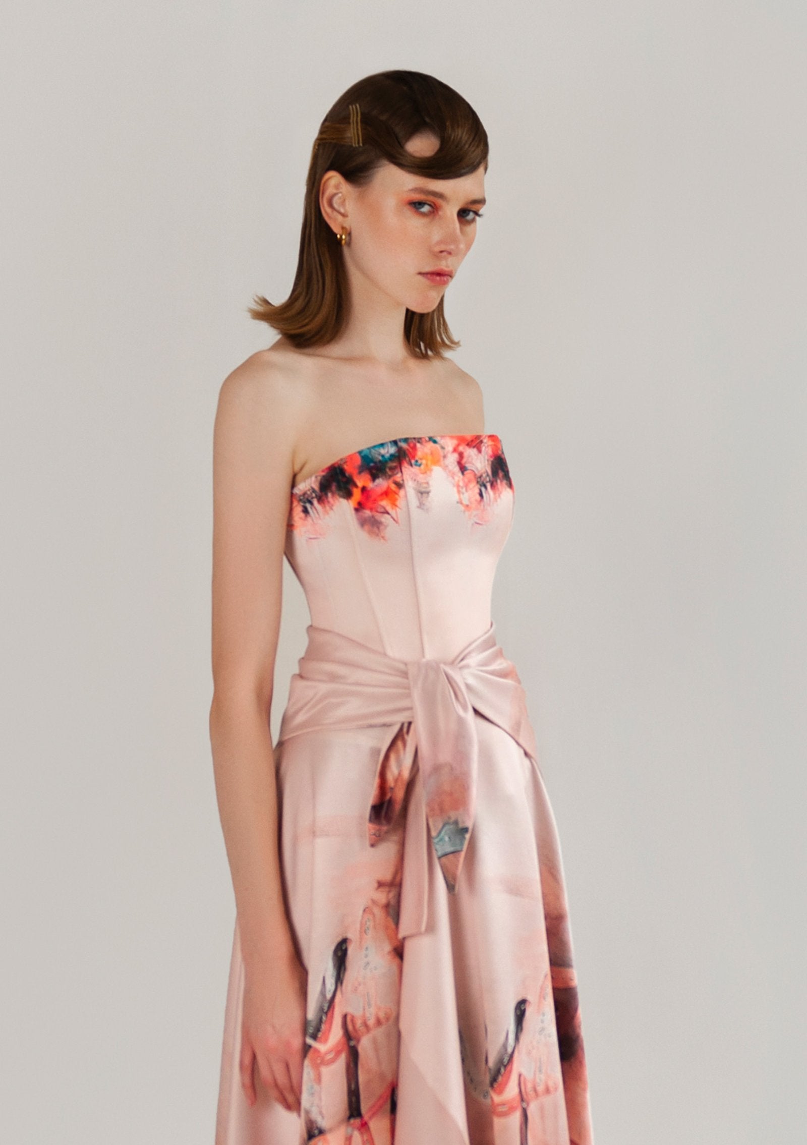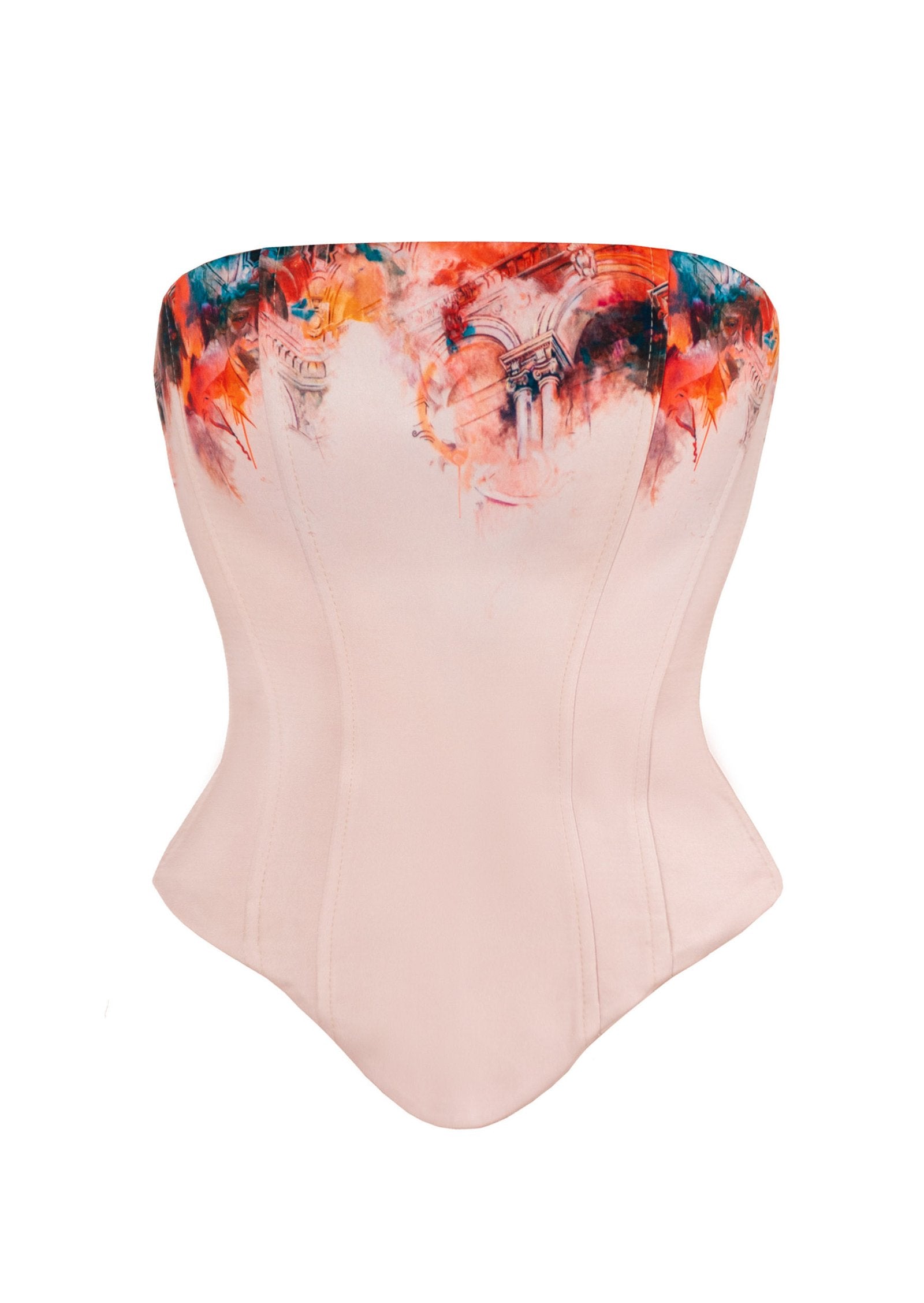 The corset is able to reduce the waist and hips, that makes the woman’s body more feminine. Arch Corset made of delicate french satin with a very bright, vibrant print around the chest line.