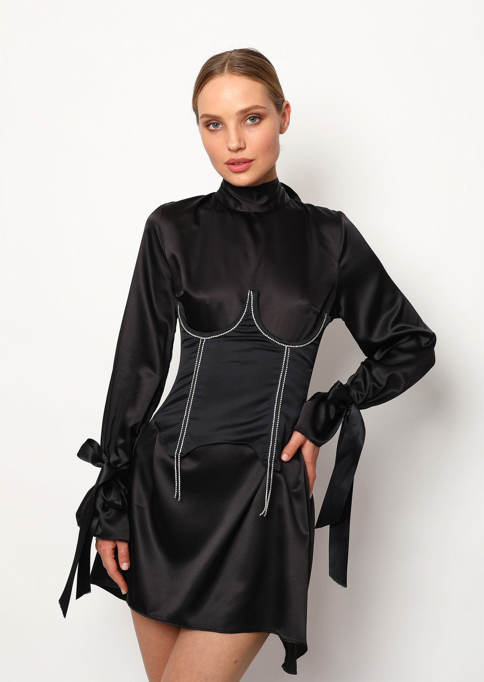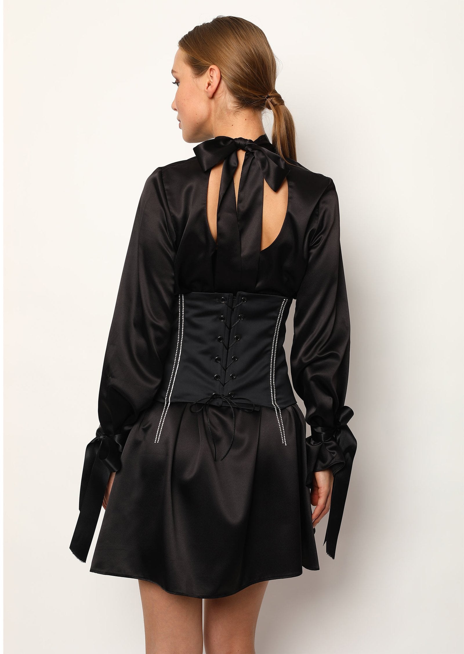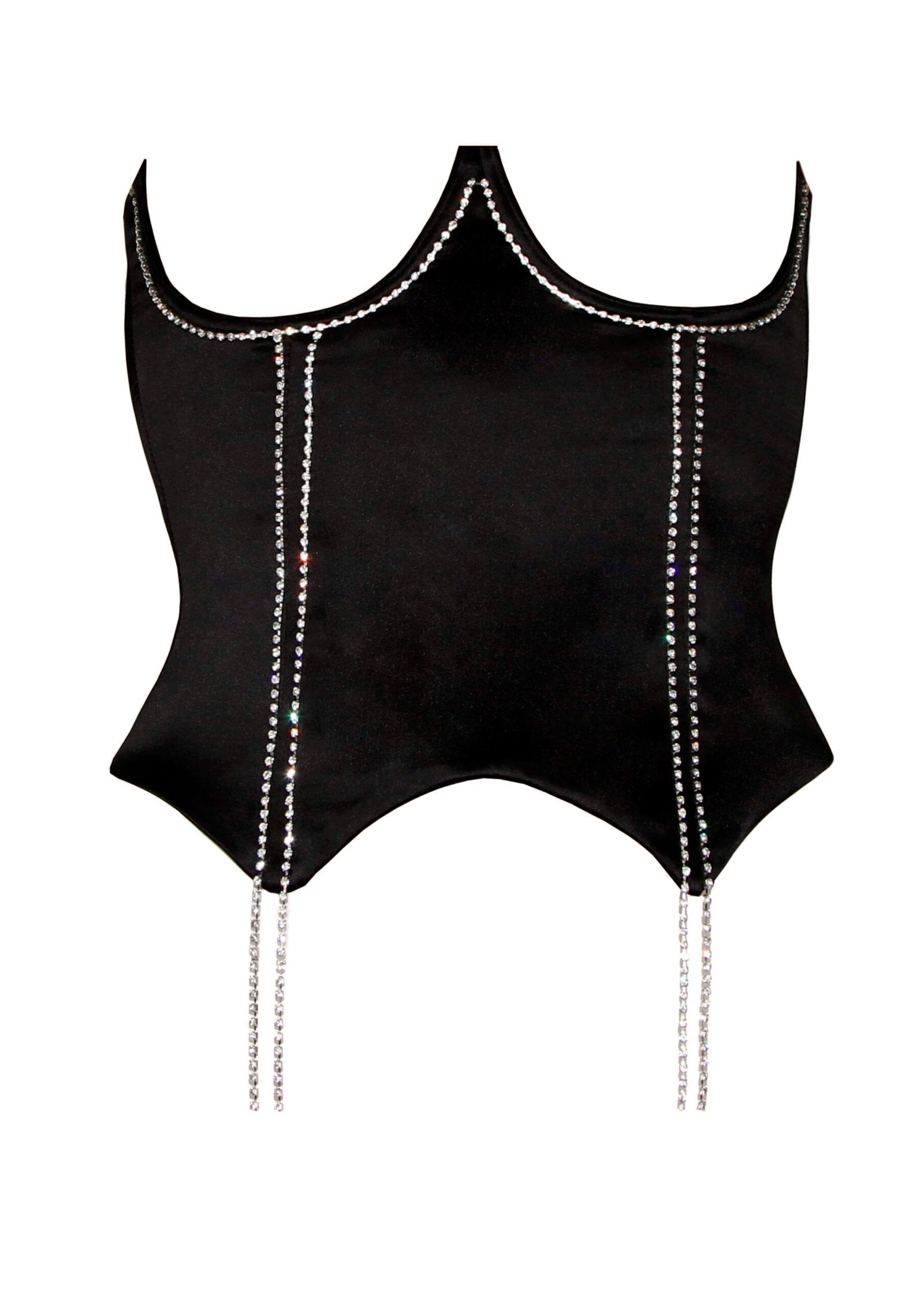 This corset from the Castle collection is embroidered with Swarovski crystals. Black Corset is a great complement to any look. It can be used in combination with minimalistic clothes or eveningwear from the Iconic collection. The corset is able to reduce the waist and hips, creating the perfect hourglass silhouette. It perfectly emphasizes woman’s body shape and makes it more elegant and feminine, thanks to embroidered crystal lines that make the wais look more slim.