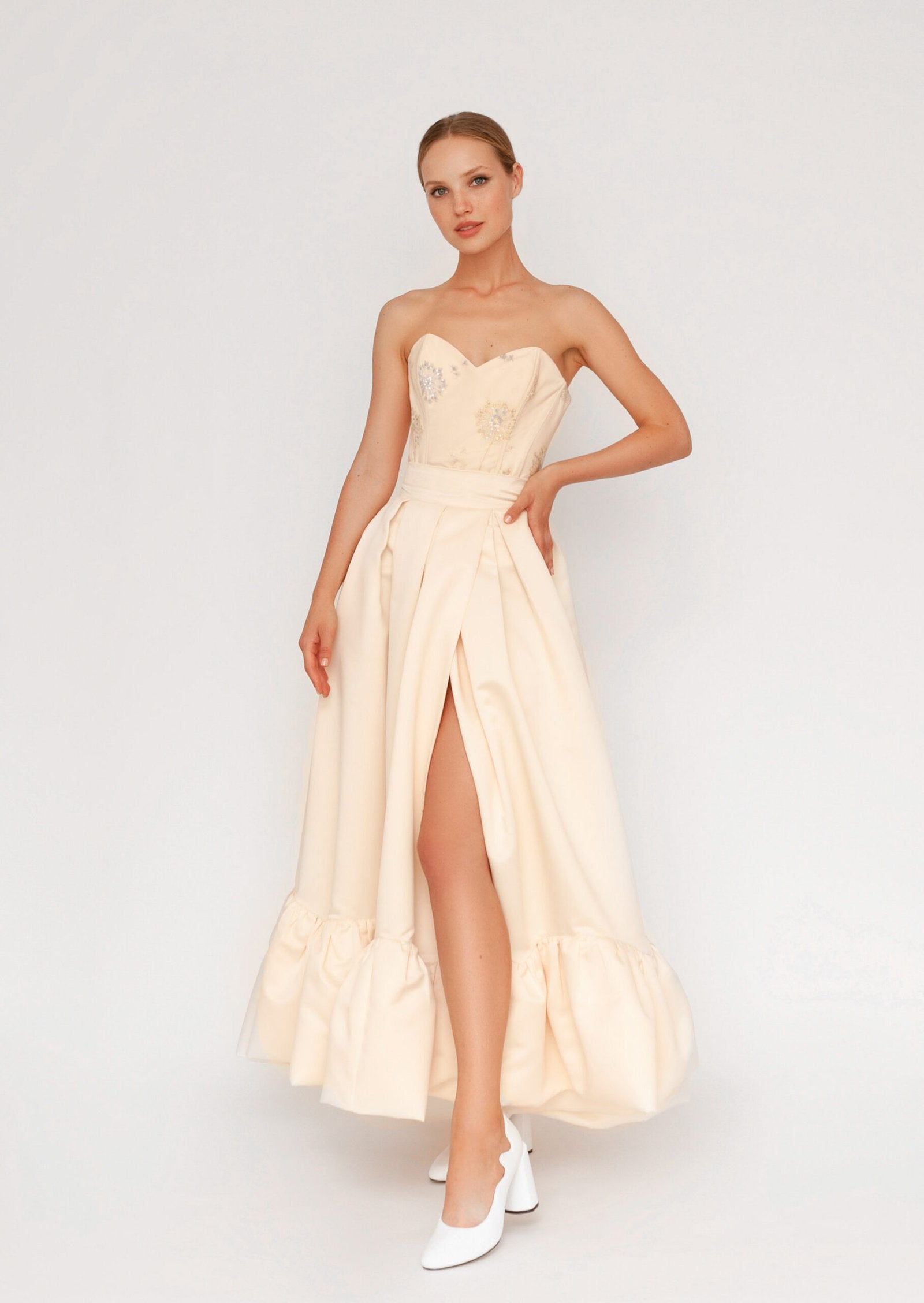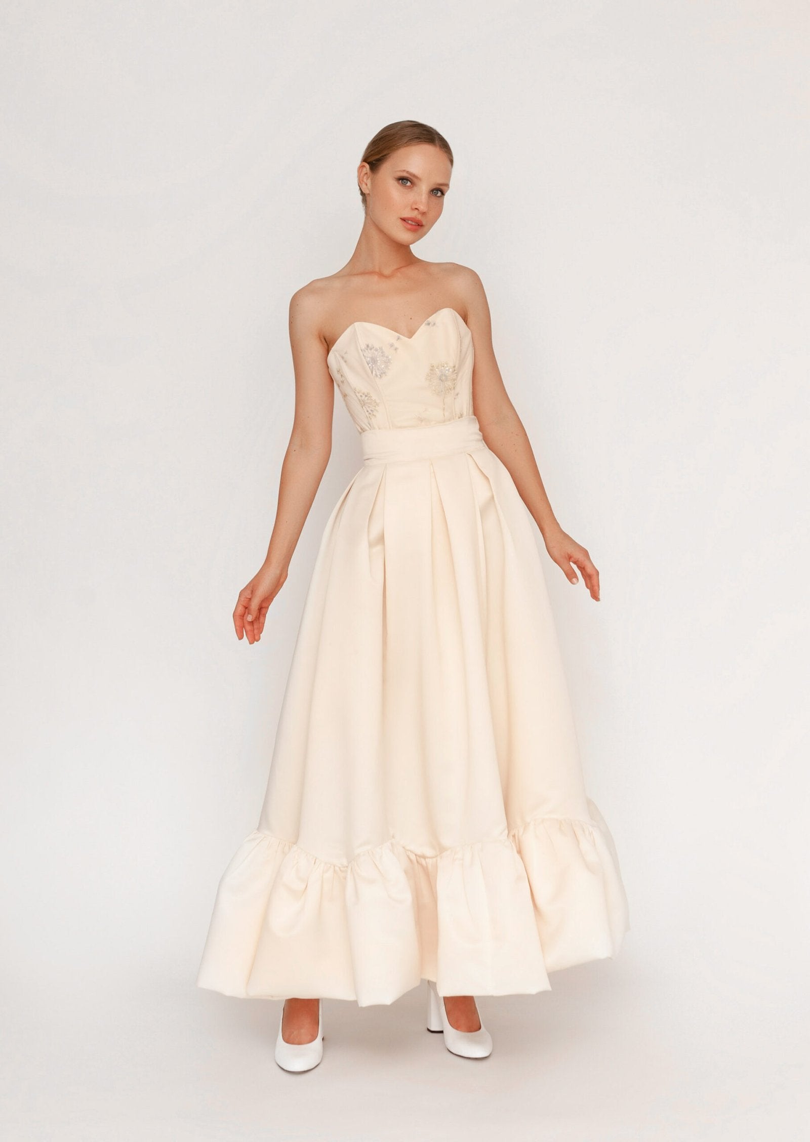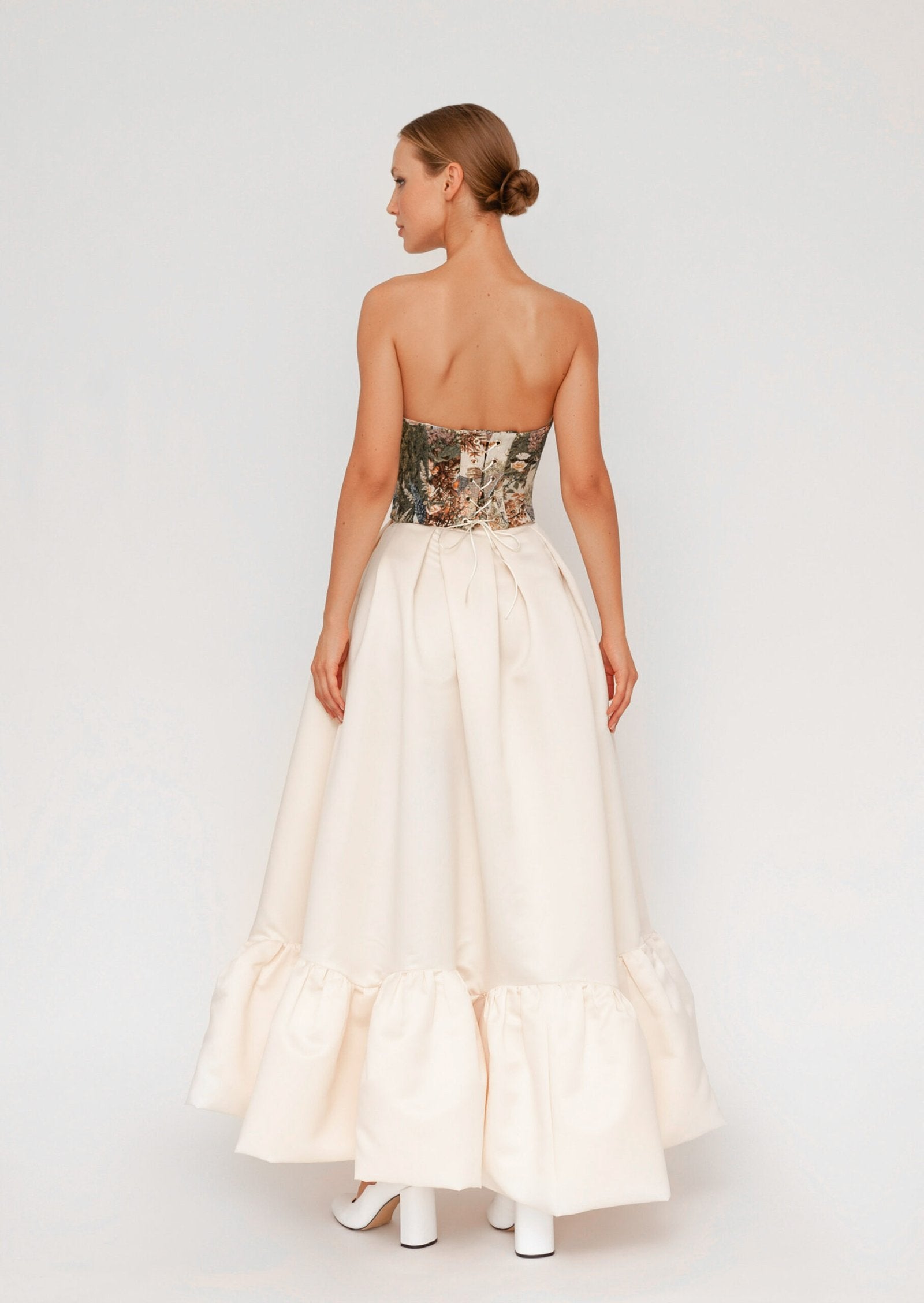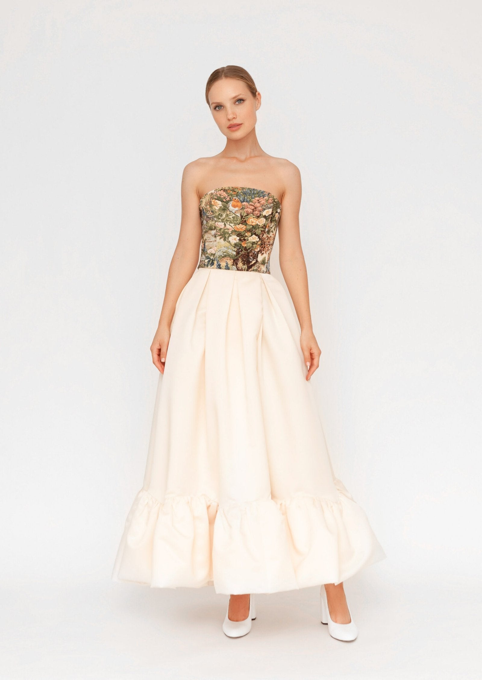 The wrap-skirt is made in midi length and fastens with a zipper on the side. Voluminous flounces along the entire bottom of the skirt add splendor and lightness to the image.