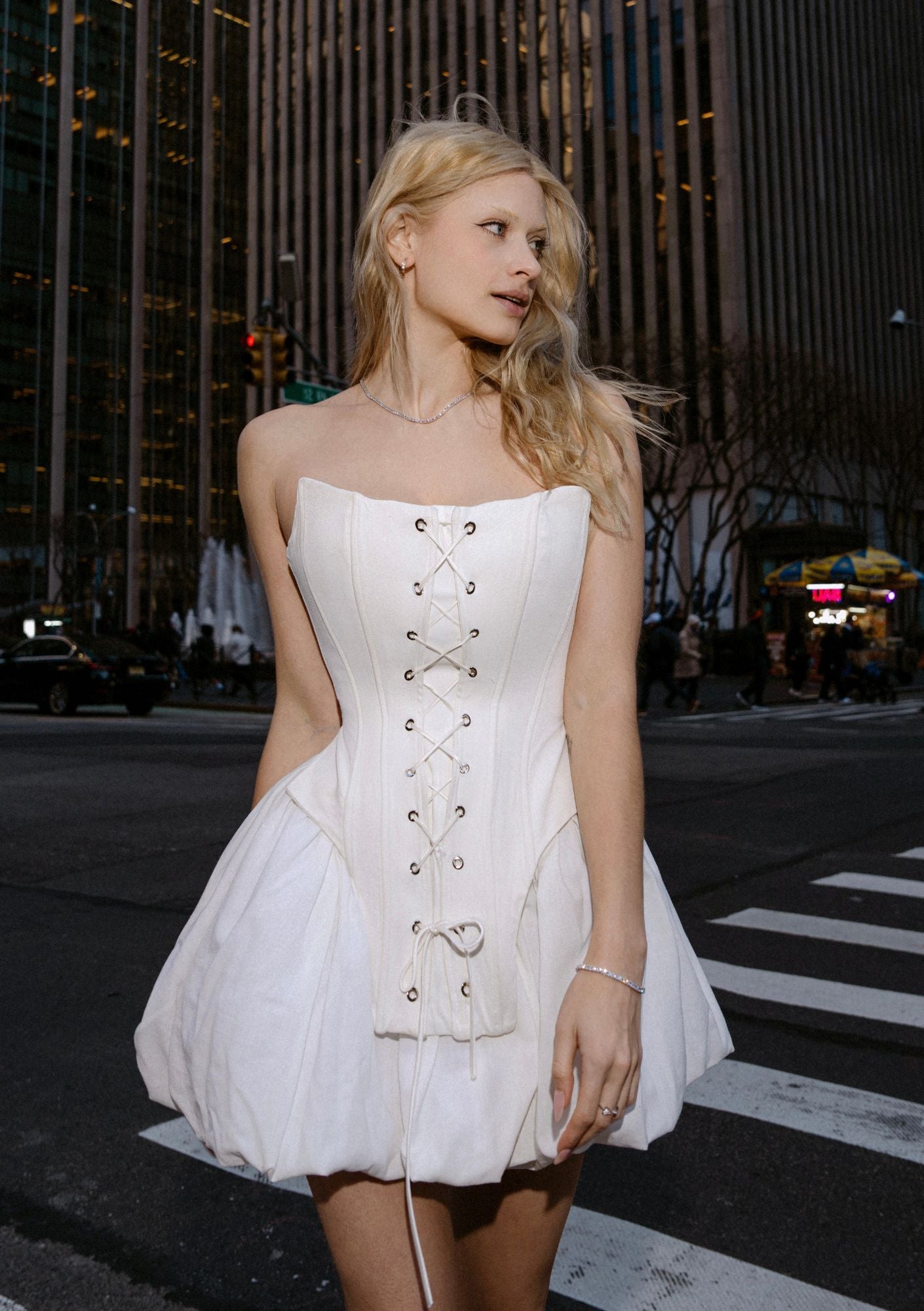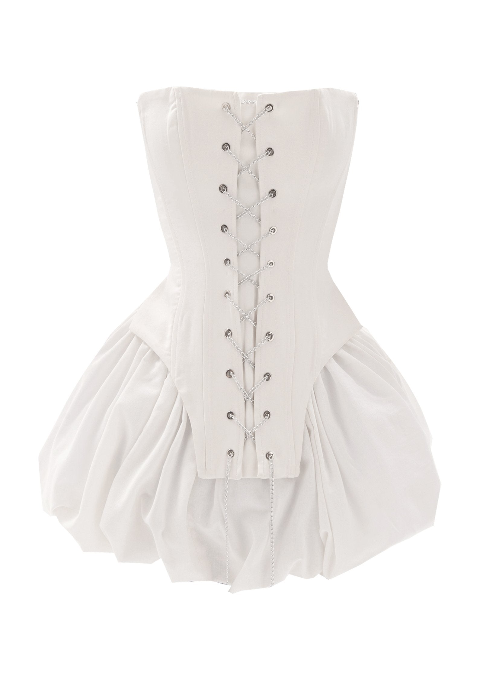 Ideal for a casual look, pair it with jeans or leather pants for an effortless yet stylish outfit. For a more formal or evening look, it makes a bold statement on its own. The corset is beautifully complemented by a voluminous white tulle tulip skirt, available for order as a set, adding a touch of elegance and drama to any occasion.