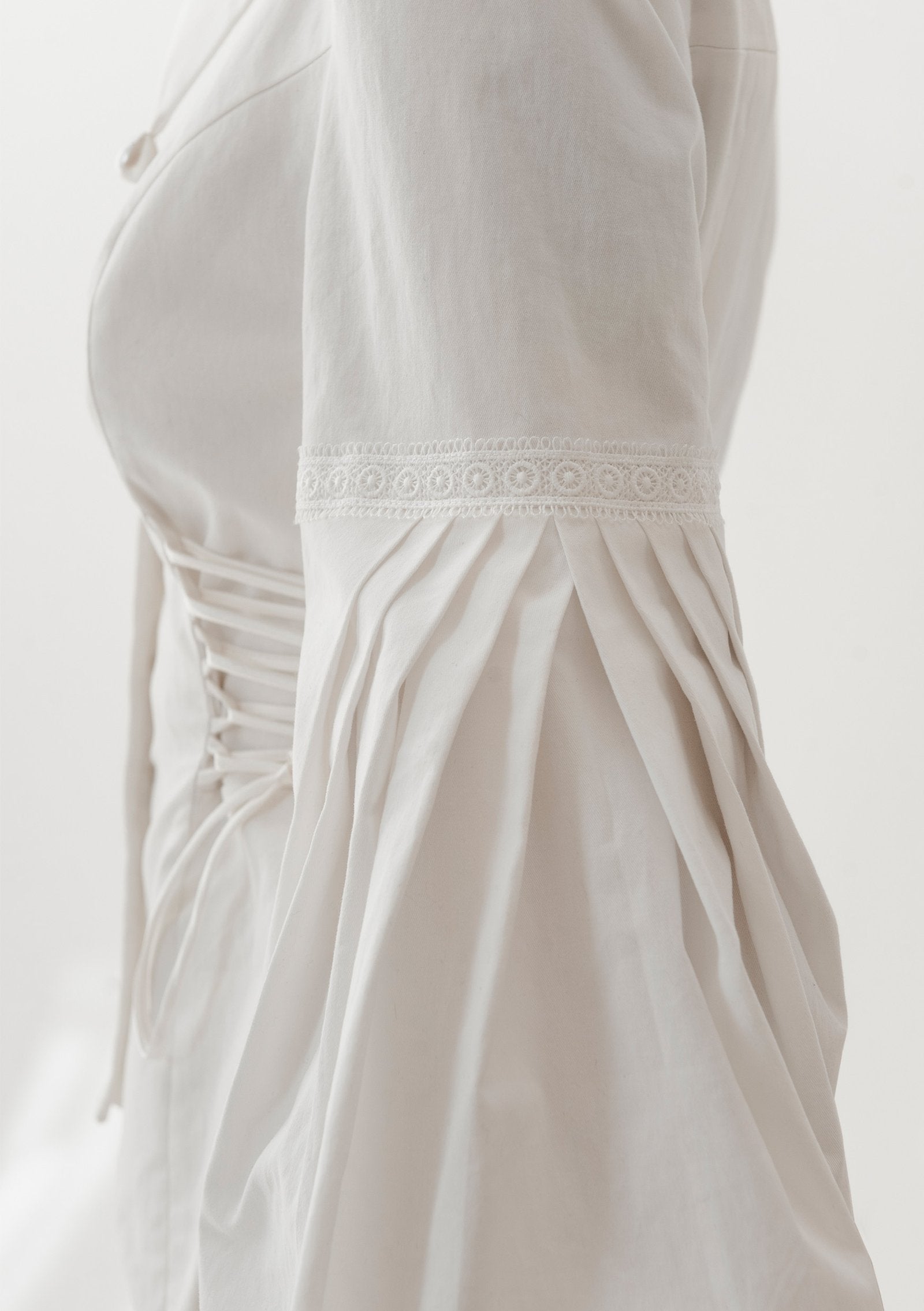 An elegant jacket perfectly emphasizes the figure with corset inserts on the sides and is made of 100% Cotton. The sleeves have ornamental trim adding ethnic motifs to the look, while the shape of the sleeve itself is inspired by a natural form of a shell. has a very nicely figured bottom ending with pearl drops.