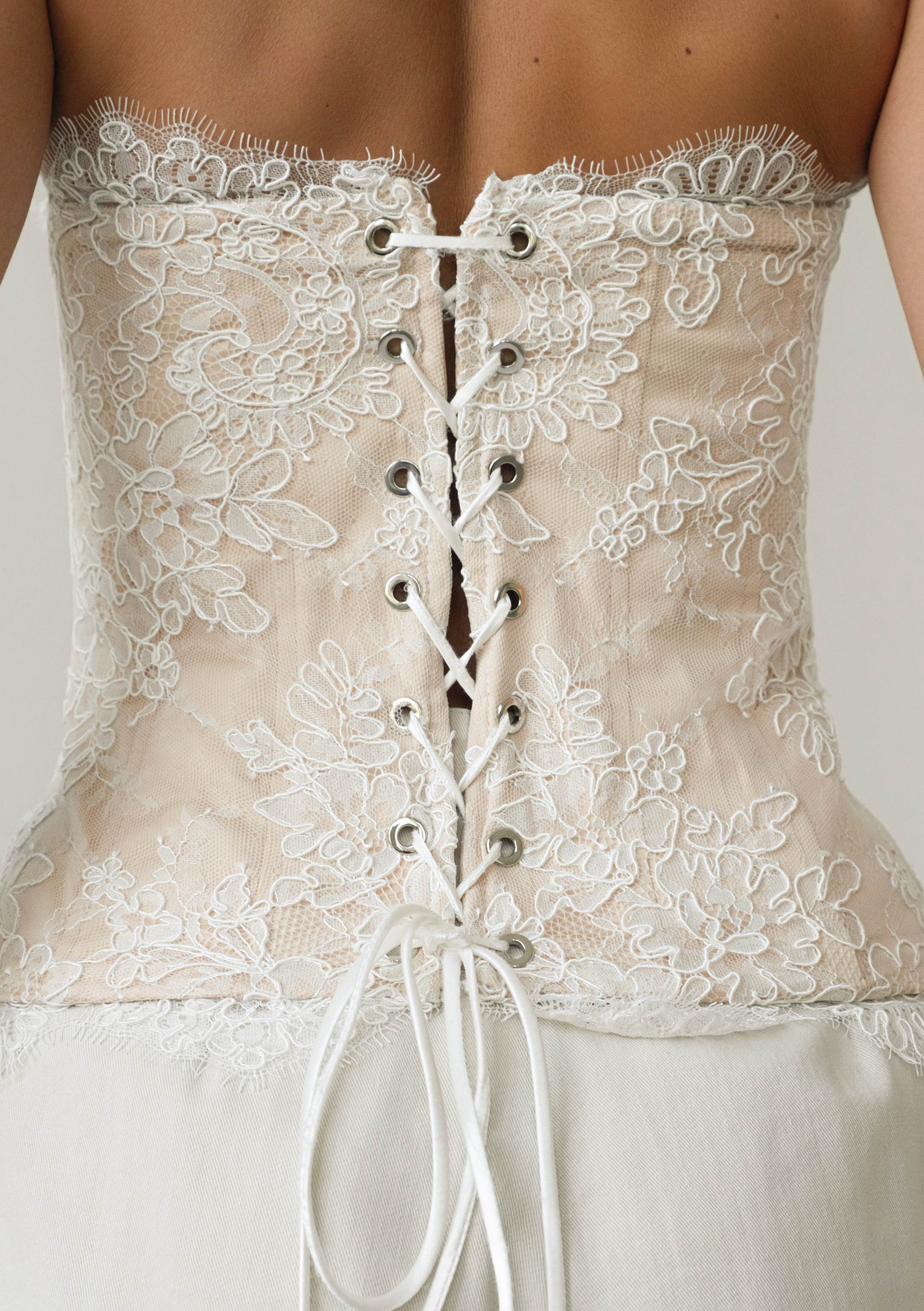 A structured strapless corset from the Renaissance collection, crafted from a nude-toned base layered with delicate white floral lace. The back features an adjustable lace-up closure for a custom fit, enhancing the waistline and providing structured support. Designed with premium materials and precise tailoring, this corset offers both comfort and a refined silhouette.