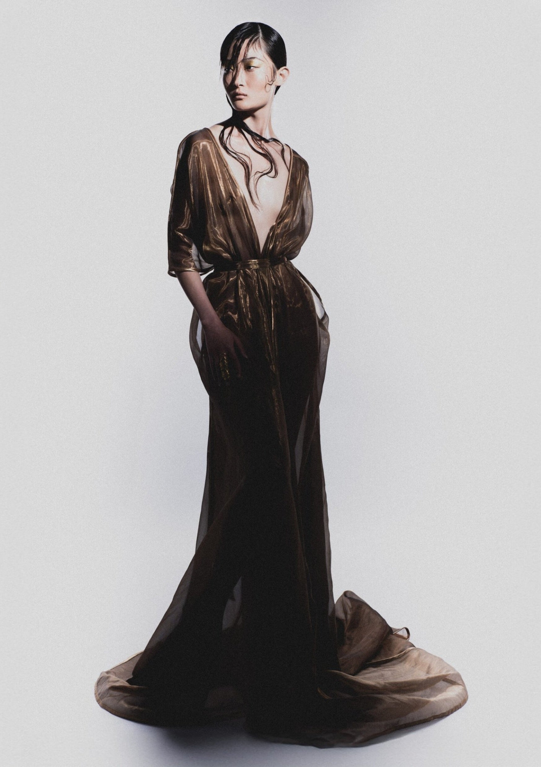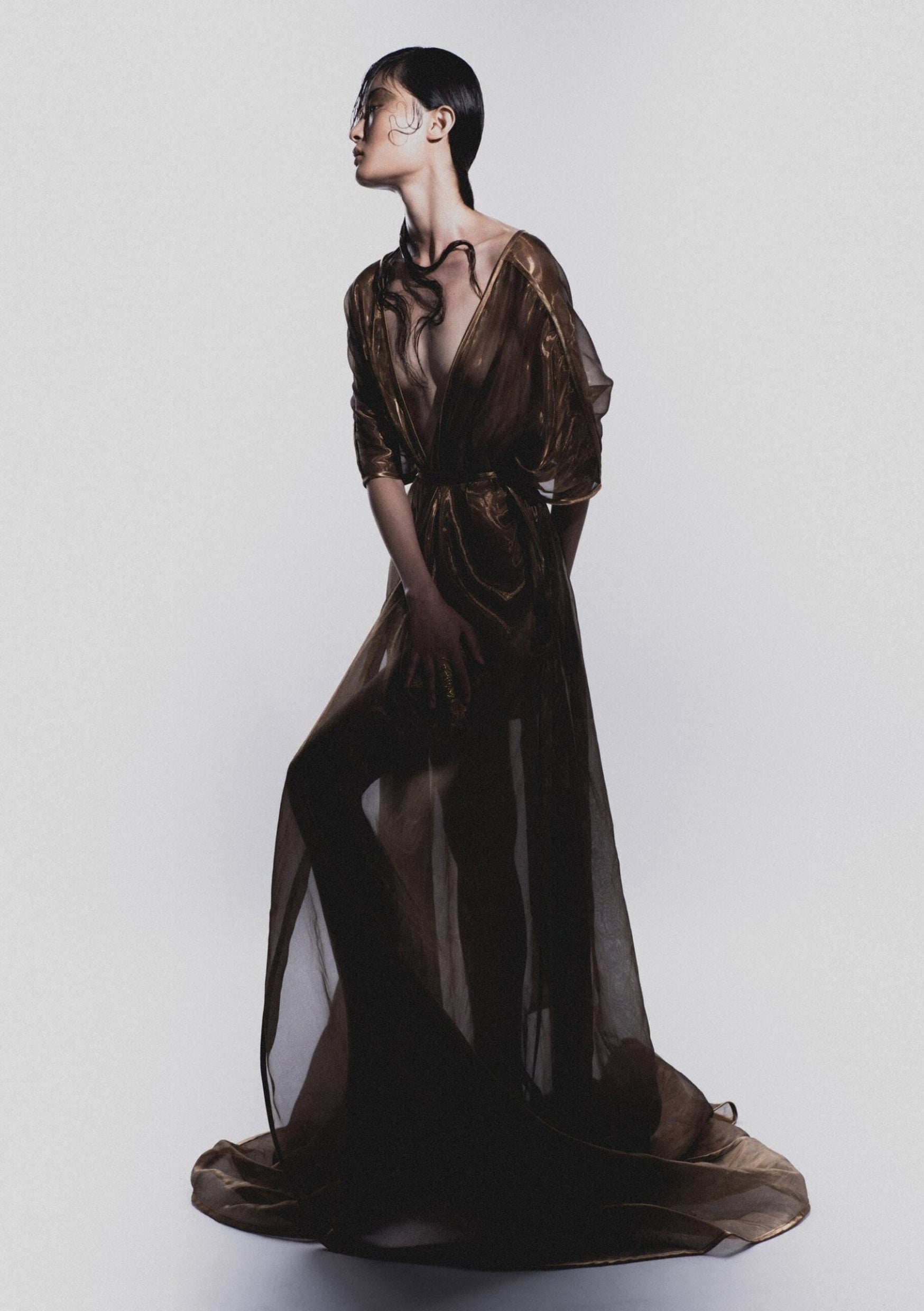 Liquid gold Kimono imitates liquid gold that seems to flow over the muse’s skin, enveloping her in a sublime feeling of luxury and harmony. The main source of inspiration was the Ukrainian flag, which represents a golden field of wheat under a clear sky. This kimono perfectly emphasises the identity of our brand’s homeland and fits into the main goal of the collection - the popularisation of Ukrainian culture.