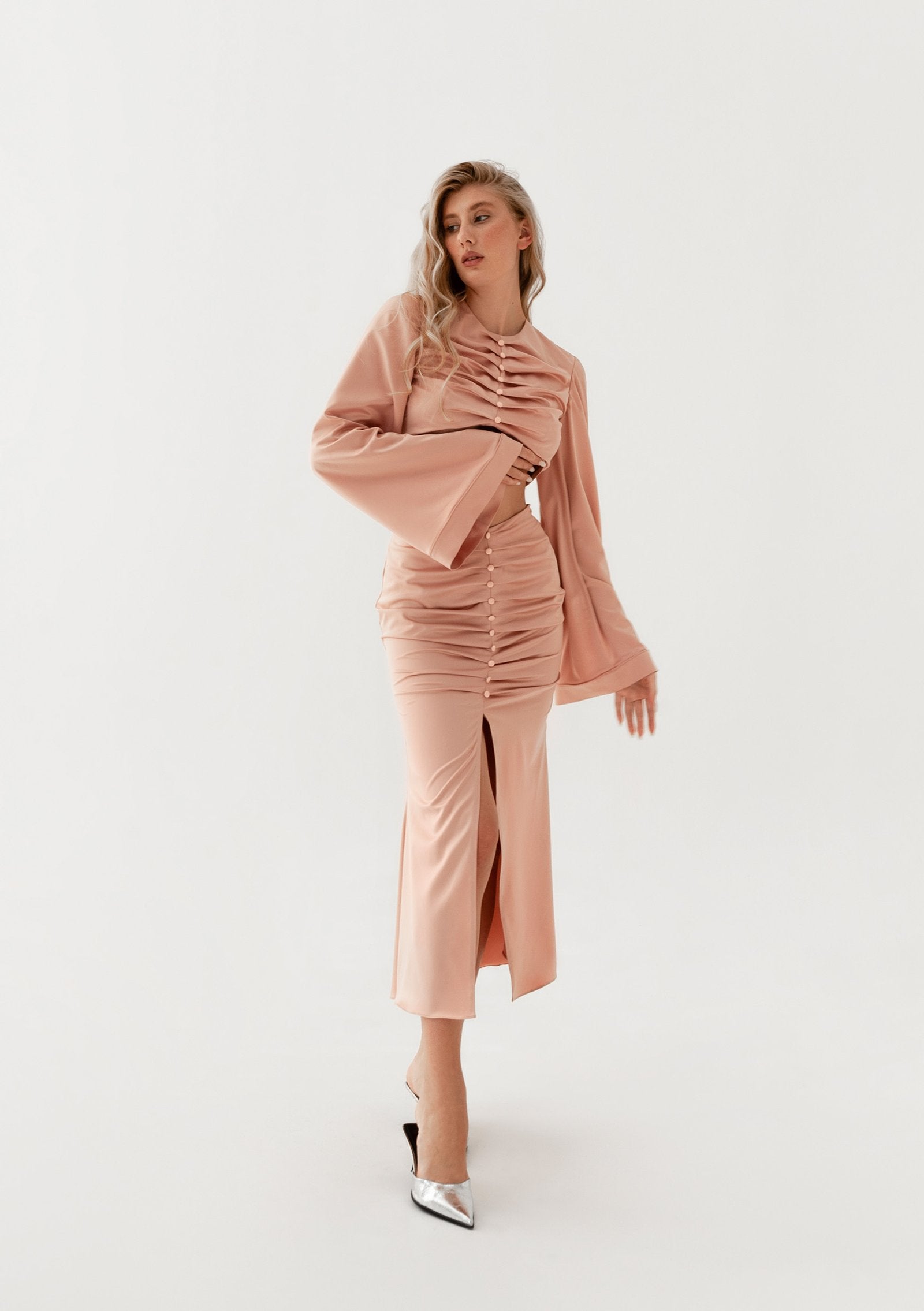 This set consists of two iconic elements made of delicate French satin: a midi skirt with a high leg slit and a long-sleeved top with a cut-out heart with ties at the back. Both set elements have pleats and silk-covered buttons on the front to make the outfit even more luxurious.