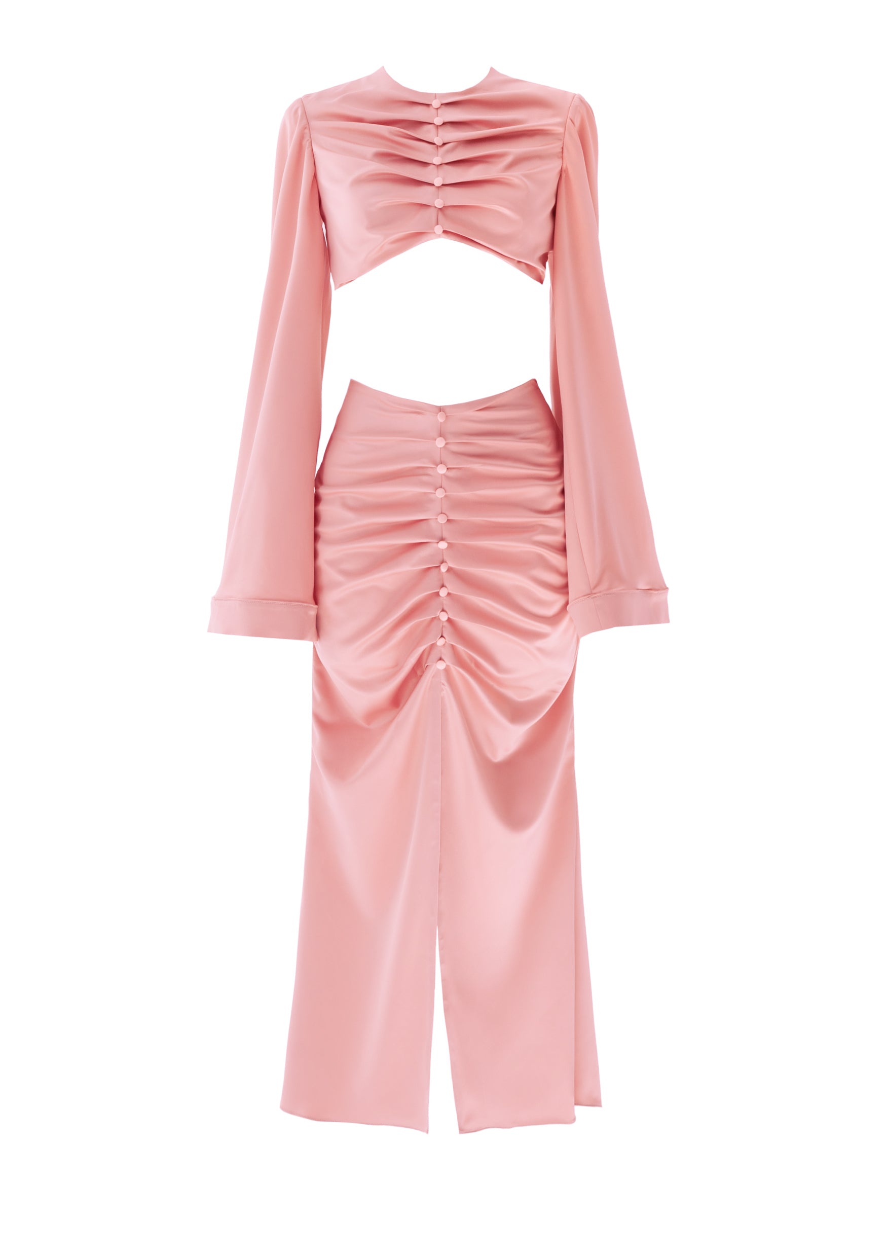 This set consists of two iconic elements made of delicate French satin: a midi skirt with a high leg slit and a long-sleeved top with a cut-out heart with ties at the back. Both set elements have pleats and silk-covered buttons on the front to make the outfit even more luxurious.