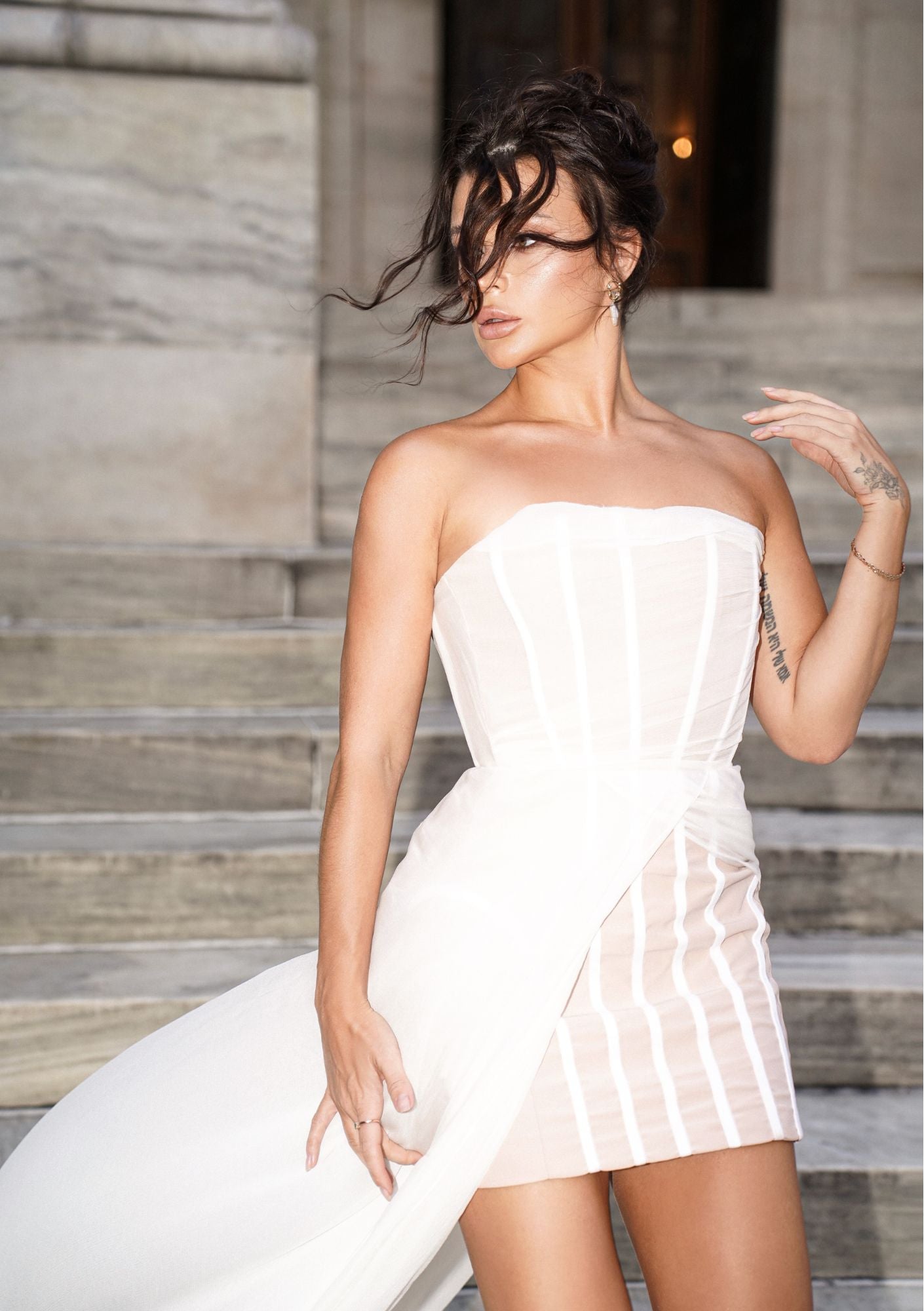 This dress, inspired by the classic tailor’s mannequin, combines structure and elegance in a truly unique design. The corset features an inner framework with lines that echo the graceful contours of a mannequin, paired with a short underskirt for a modern touch.
