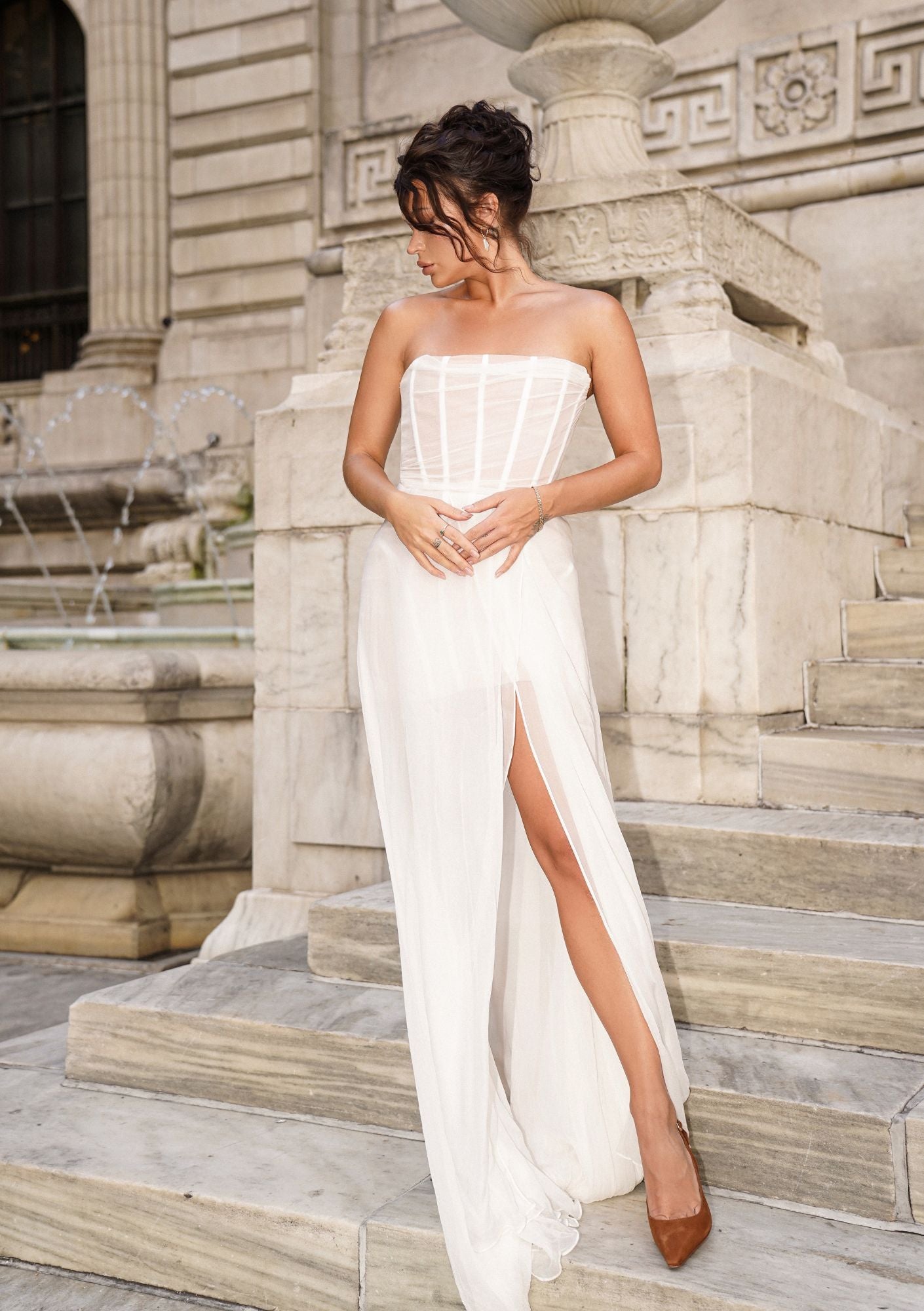 Over the structured base, soft draping and a multi-layered skirt crafted from white silk chiffon create a flowing, airy silhouette. The light, weightless design moves beautifully, making it perfect for special occasions.