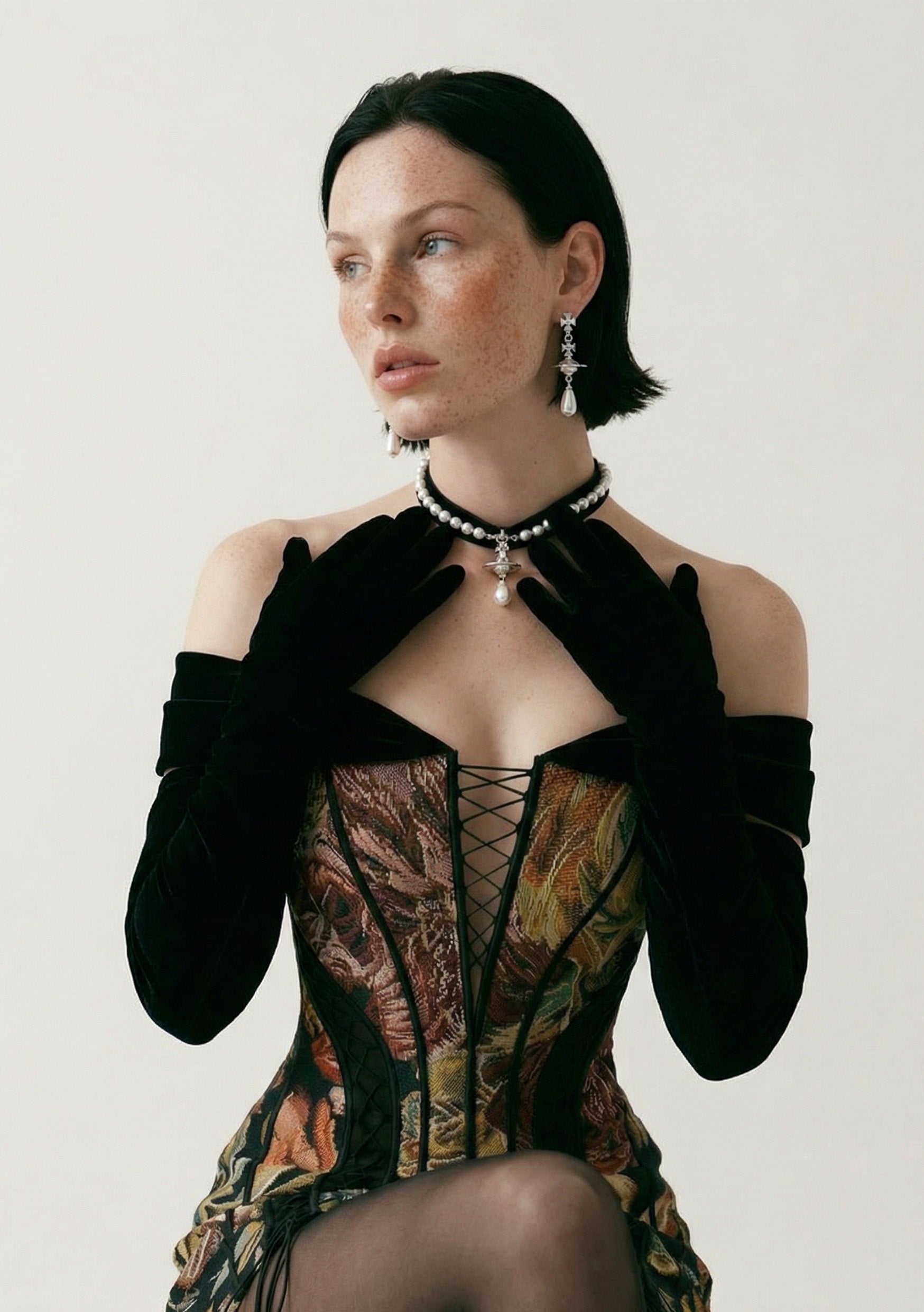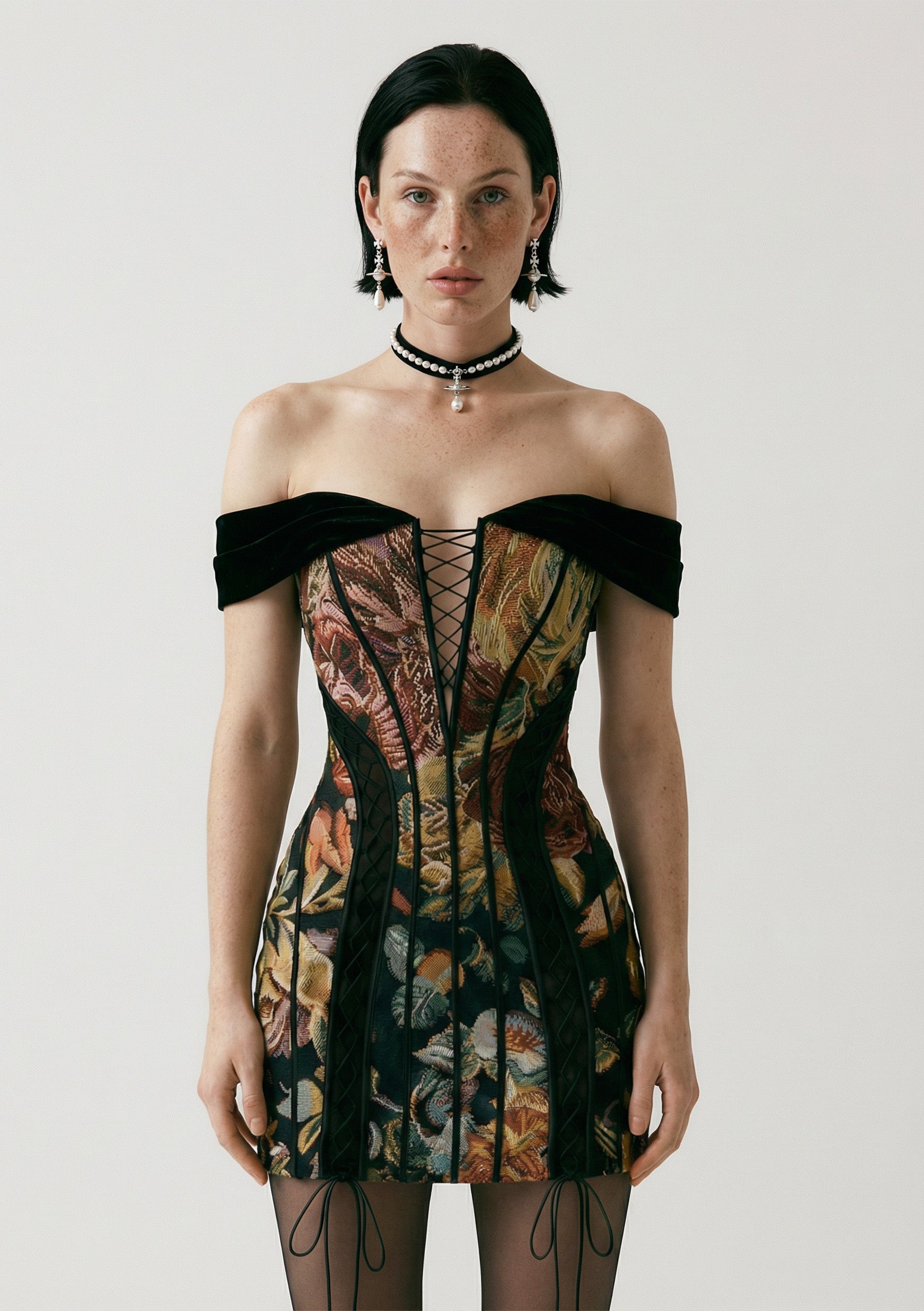 Nocturna Dress is a luxury corset mini dress crafted from exclusive tapestry fabric, designed to sculpt the feminine silhouette. Engineered relief seams visually contour the body, define the waist and create an elegant hourglass shape — flattering for all body types.