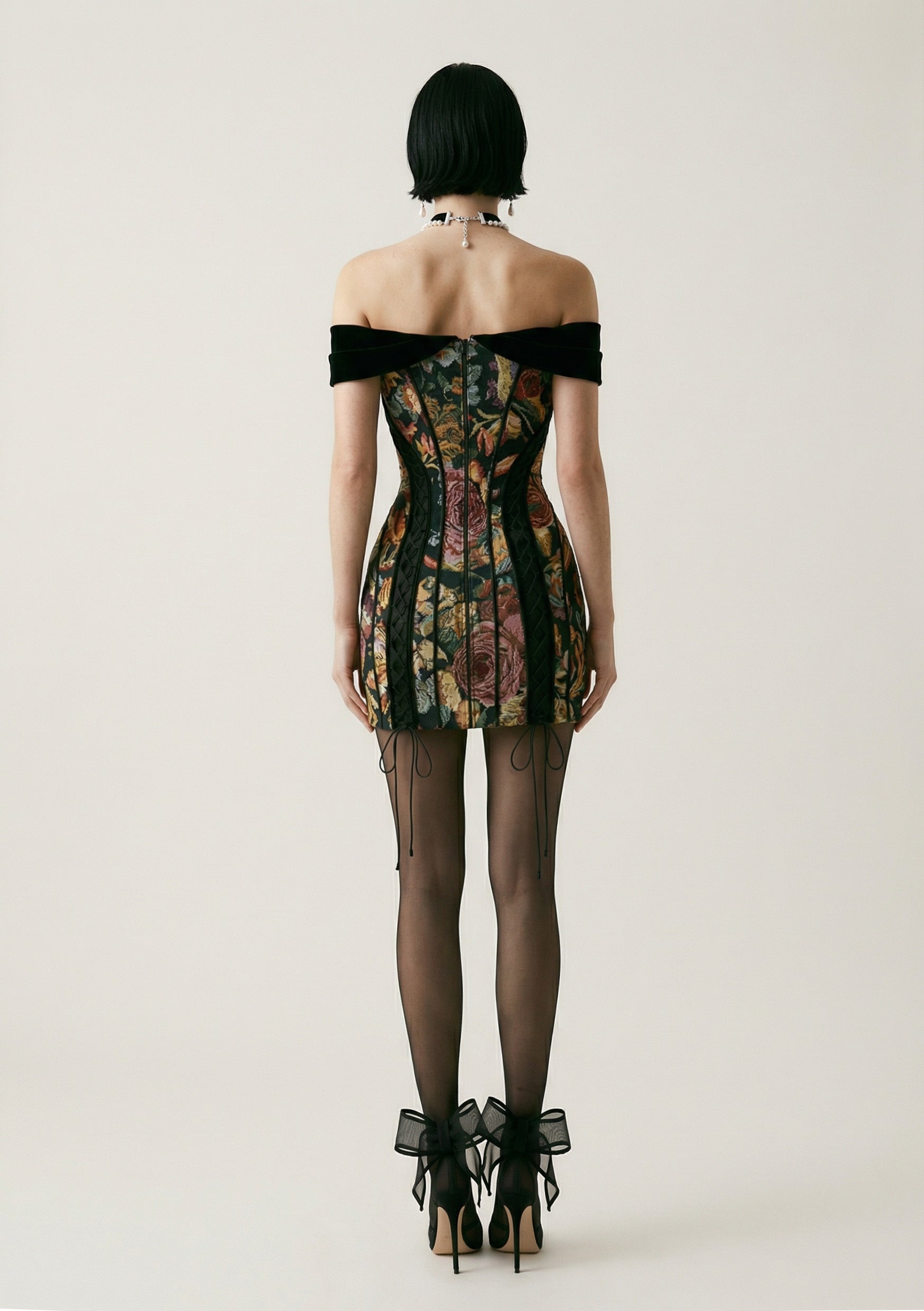 The off-shoulder neckline highlights the collarbones, while the structured corset bodice offers support and shape. Rich tapestry texture adds depth and timeless statement appeal, making it perfect as an evening dress, cocktail dress, party dress or special occasion mini.