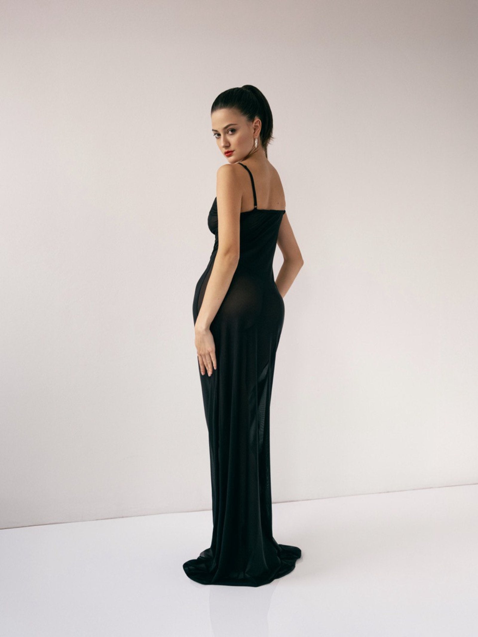 Daring yet sophisticated, the Noir Eclipse Gown is designed for those who love to make a statement. This floor-length, figure-hugging dress is crafted from sheer black mesh, creating a seductive silhouette while maintaining an air of elegance. Structured bust cups provide support and shape, offering the perfect balance between boldness and refinement. An ideal choice for glamorous evenings, high-profile events, and striking photoshoots.
