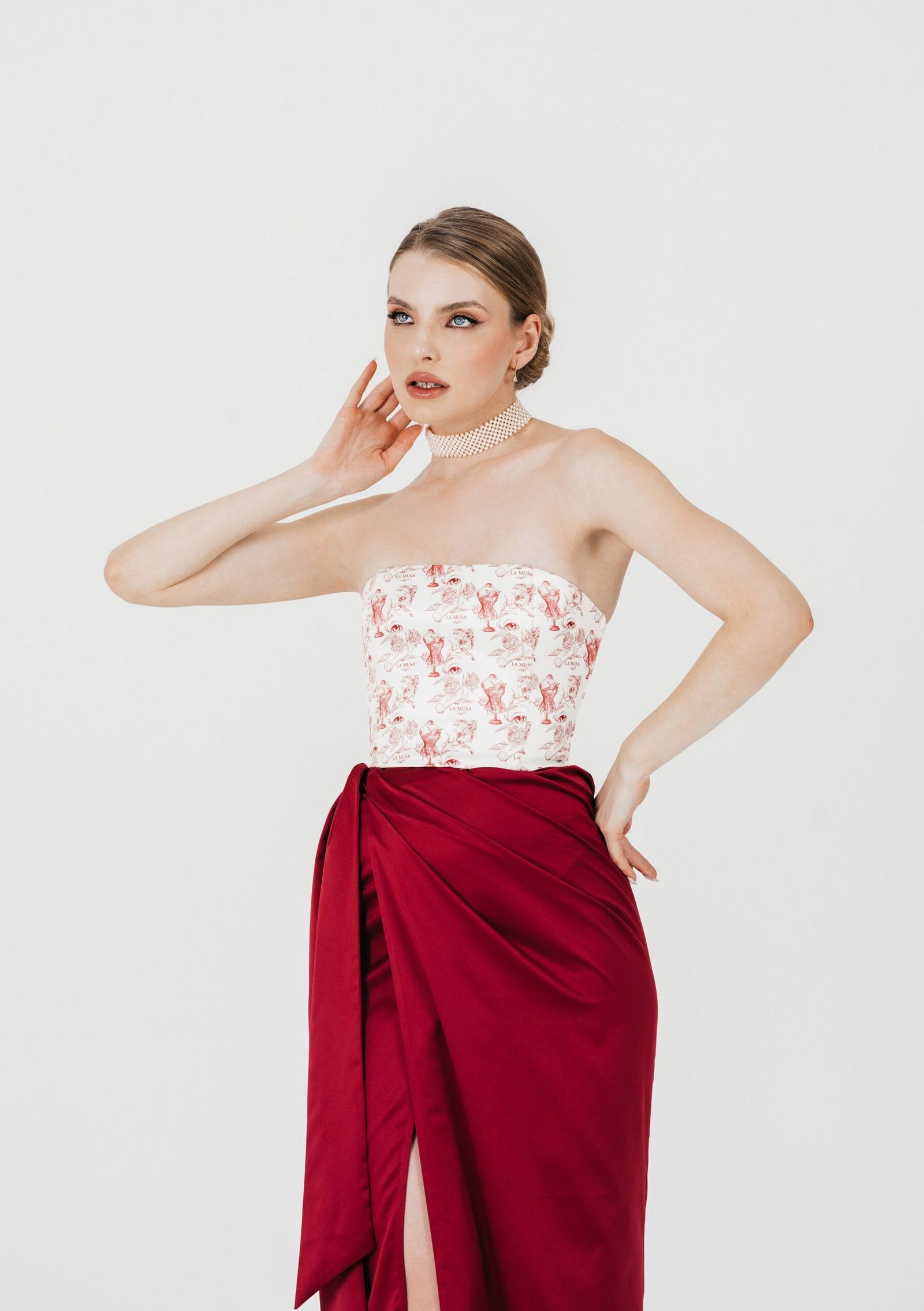 Cherry Porcelain Corset, made of delicate French satin, is a new LA MUSA product for women who want to emphasize their daintiness and grace. This luxurious shortened corset will perfectly emphasize the bust, while the waist is tightened. It can be worn with matching ribbon straps or without anything at all, since it is corseted, it will stay firmly on the chest and create a perfect hourglass silhouette.