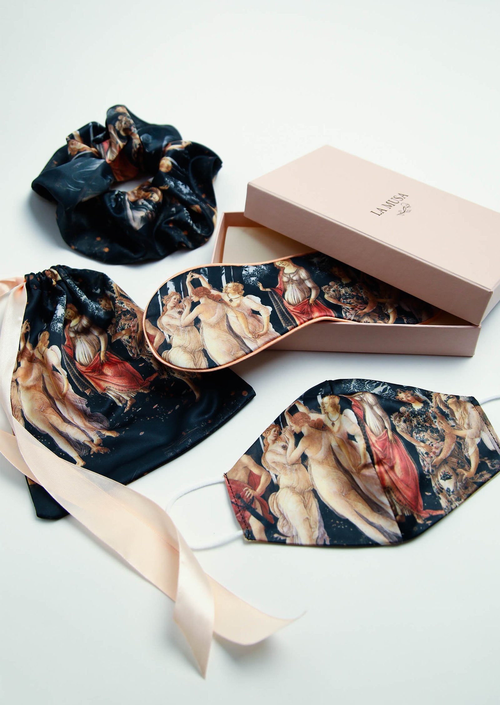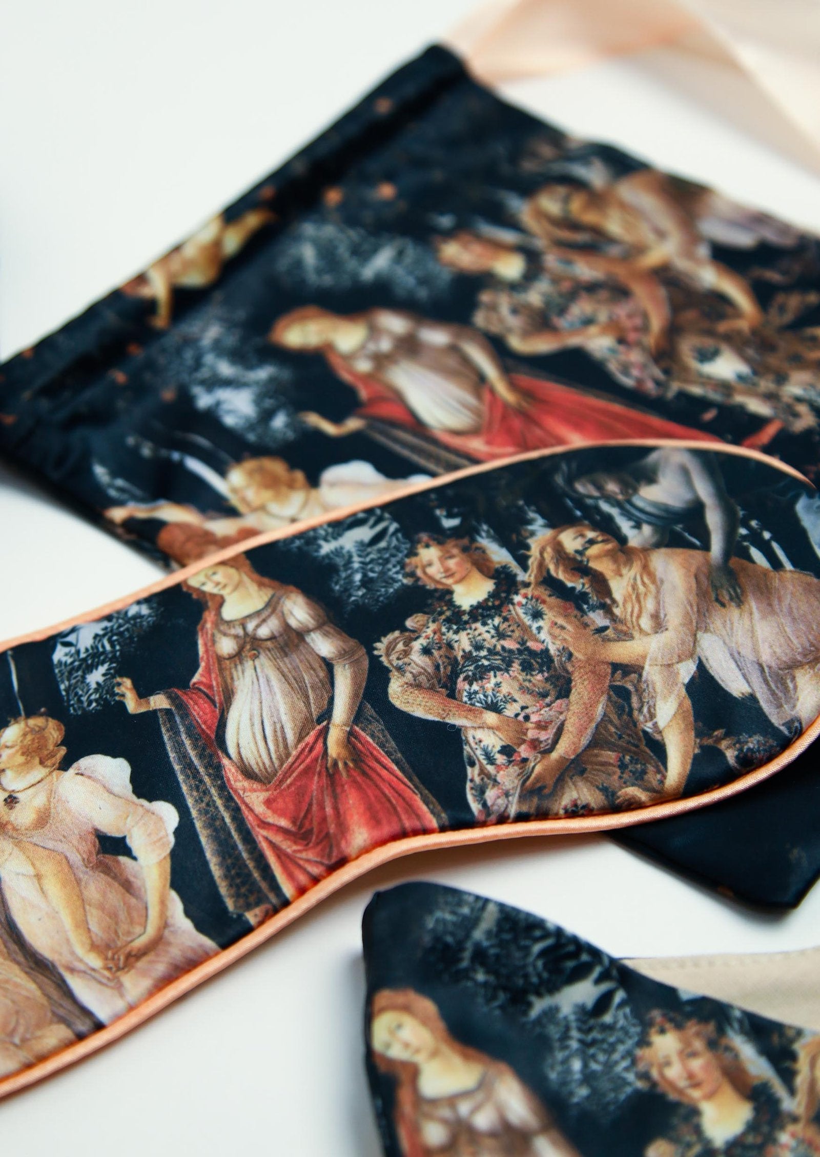 Primavera Merch Set inspired by the painting of Sandro Botticelli, “Primavera” (late 1470s – early 1480s). We have chosen this painting as a print not only because of its exquisite grandeur, but also bacause it emphasizes the idea that every woman is unique, just like flowers in the heavenly garden. There are 170 kinds of flowers in this painting. Botanists could only recognize a part of them, as some of these flowers don’t exist in our time.