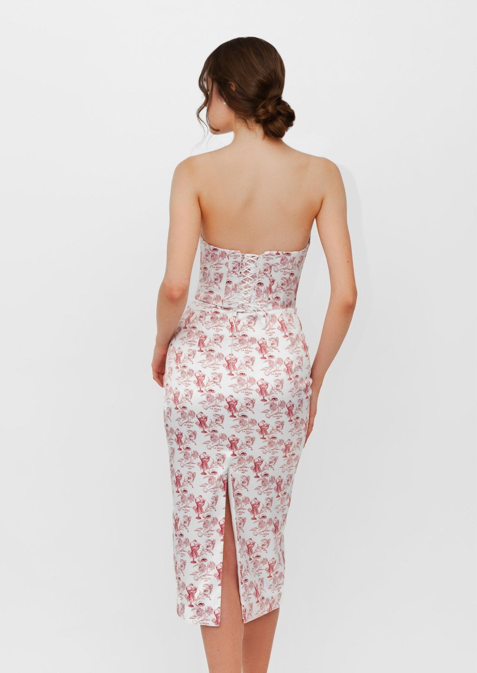 Red Porcelain Skirt, made of delicate French satin, is a new LA MUSA product for women that want to emphasize their daintiness and grace. It has a hidden zipper and buttons, elastic ribbon at the waistline and gentle cut at the back.