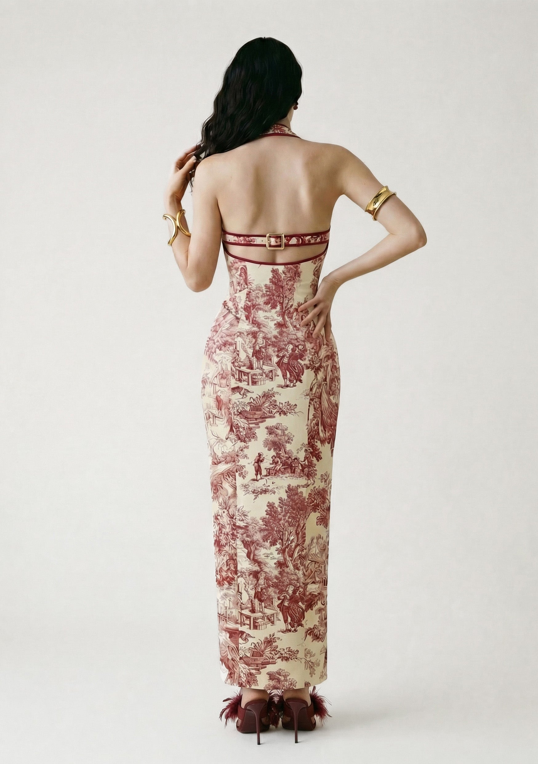Designed in a rich wine-red toile print on an ivory base, this statement piece brings the elegance of antique tapestry artistry into a contemporary evening silhouette. A front slit adds movement and ease, making it perfect for cocktail parties, formal events, galas, weddings, and red-carpet moments—whenever you want a memorable entrance.