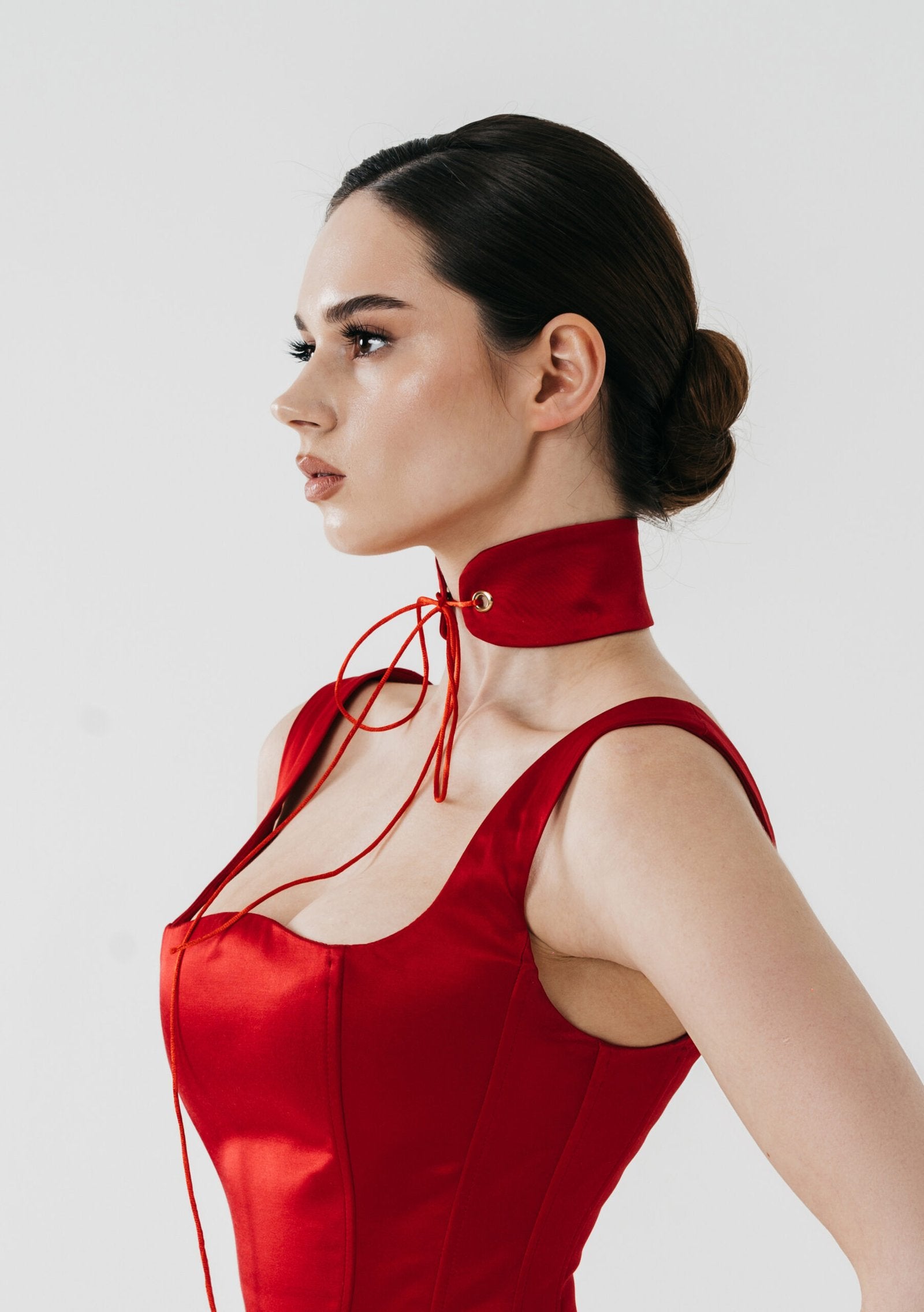 The corset is made of delicate French blood-red satin and comes with a matching rose choker accessory. Since the back is tightened with the laces it will stay firmly on the chest and create a perfect hourglass silhouette while emphasizing your figure in the most sensual way. This top is a great complement to stunning evening skirts, however, being an iconic product on its own it is a great complement to any outfit from your wardrobe.