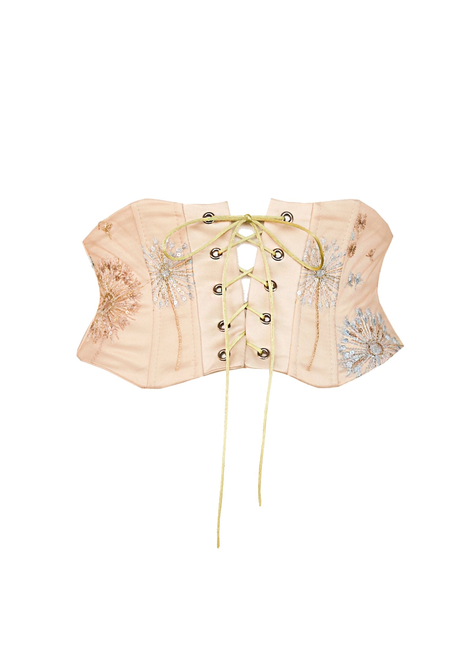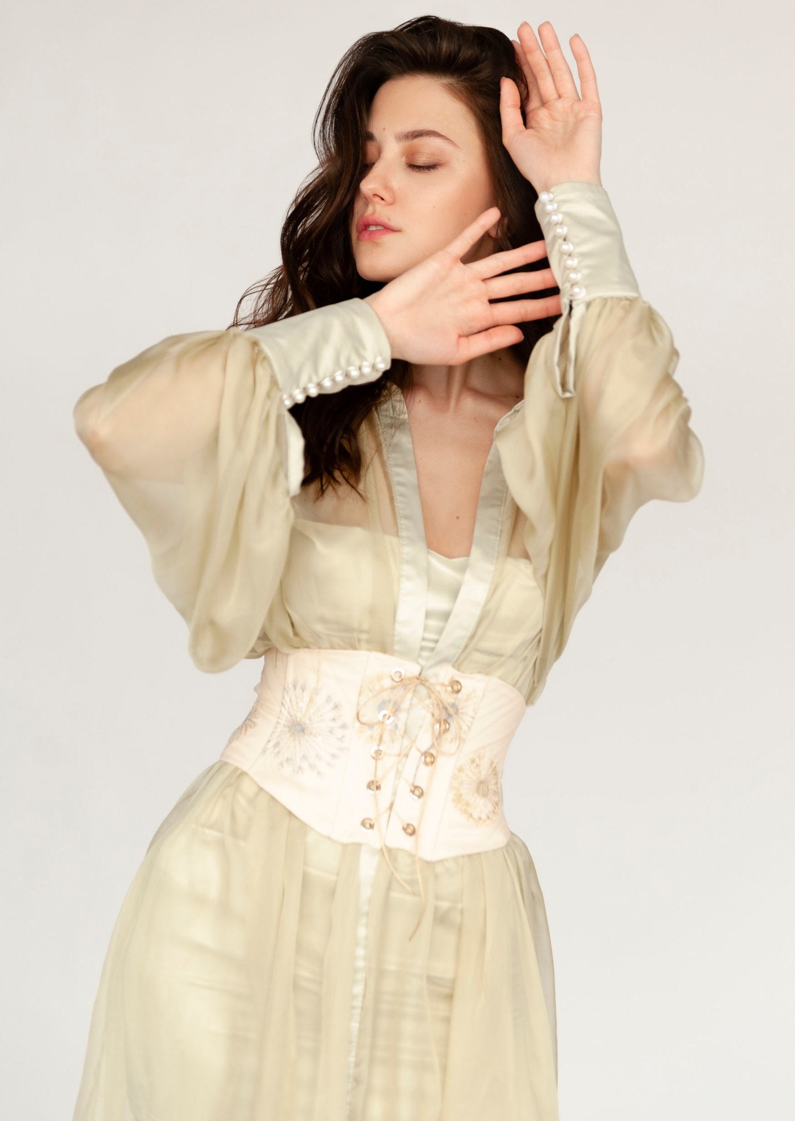 The first LA MUSA corset with a fixating lacing in the front. This type of corsets is ideal for those who want to make their waist look more slim but keep the lightness and the freedom of shape. With this corset put on, woman’s waist will get a perfect hourglass silhouette. Hand embroidery on the net with a composition of dandelions on a soft yellow background will be ideal for classic dresses of pastel colours in the manner of the Angel Slip Dress from the Silenzio collection.