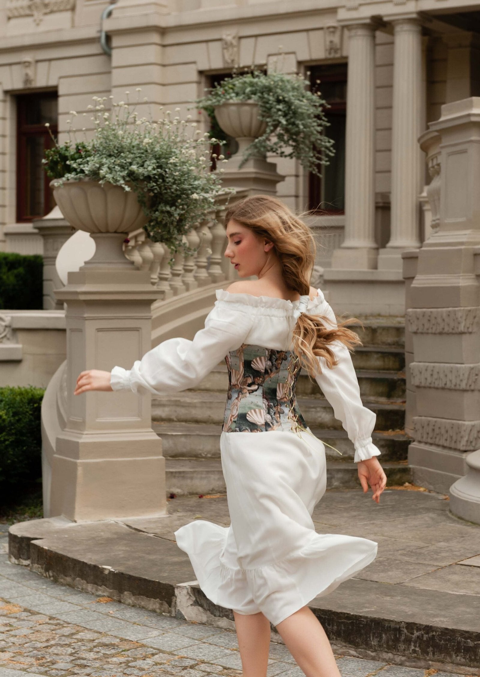 When working on this corset, the designer kept in mind our audience requests and created classical fit corset with covered chest with the most iconic LA MUSA print with the painting of Sandro Botticelli, “The Birth of Venus”. This corset combines an exquisite print and a perfect shape that creates an ideal hourglass look. The soft outlines and delicate colours make a woman feel just like the muse in the painting. Corset with chest fixation with shaping bones along the product creates an hourglass silhouette.