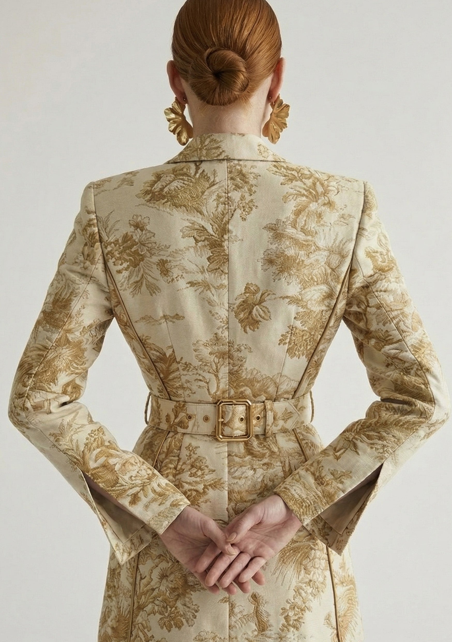 A refined touch of gold piping runs along the entire collar, catching the light and elevating the tapestry-inspired toile. The blazer is single-breasted, with paired buttons (two placed together) to create a more editorial, distinctive finish. Elegant cuff slits add polish and make layering effortless—especially with a crisp shirt underneath, letting the cuffs show beautifully.